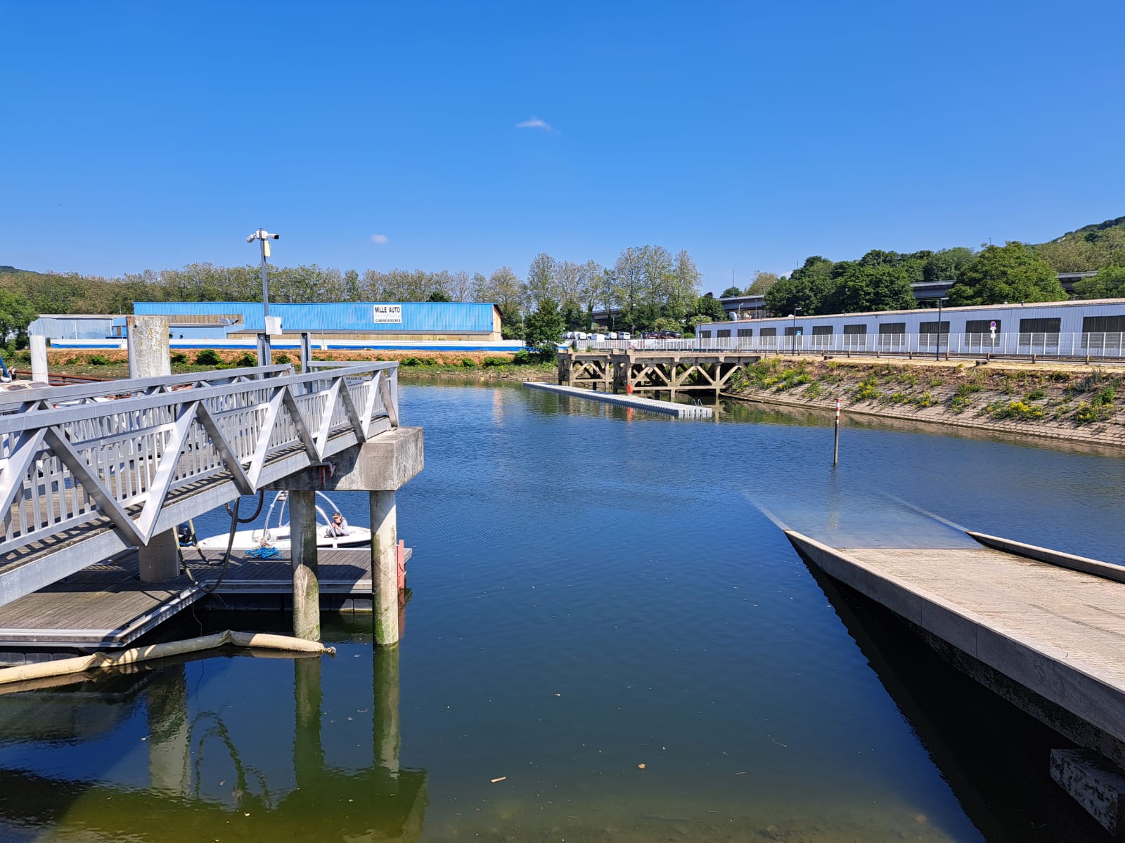 Pontons multi-usage réservés à l’organisation de l’Armada de Rouen 2023. Le plus grand des deux est doté d’une base à bateau en bout pour le semi-rigide des pompiers.