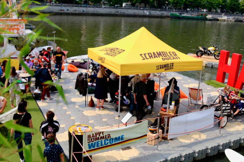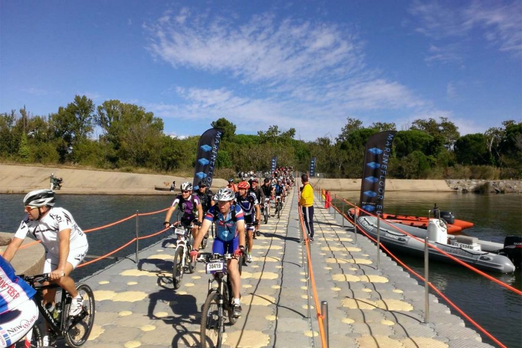 Notre implication peut être un seul élément du projet (une passerelle de traversée, un ponton d’embarquement, une terrasse flottante, un ponton de cheminement, …) ou le centre de l’événement (terrain de rugby, scène flottante, bassin de nage, terrasse avec tente de réception, …)